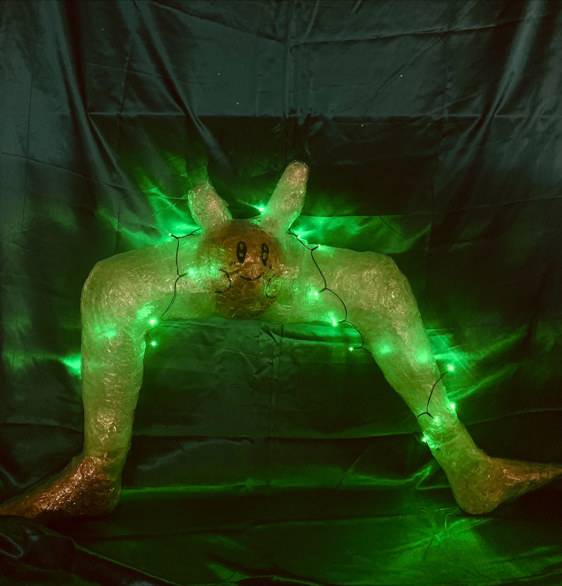 «Deux élèves ont voulu se prêter au jeu en réalisant une structure de papier collant pour représenter un être absurde et loufoque. Ils souhaitaient mettre en lumière le côté commercial et plastique de cette festivité qui, à la base, a des racines religieuses. Le lapin, qui a maintenant grandi avec ses jambes d’humain, se réjouit que les gens achètent sans limite des bidules inutiles et sans intérêt, fabriqués à la chaîne qui seront bientôt dans notre poubelle.» – Jade Lavoie-Laliberté, enseignante, Centre d’éducation des adultes Outremont